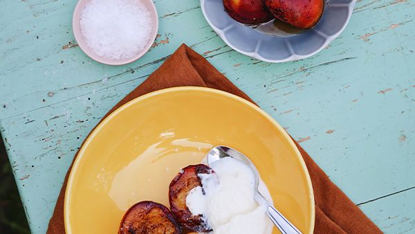 Campfire grilled spiced peaches with ice cream