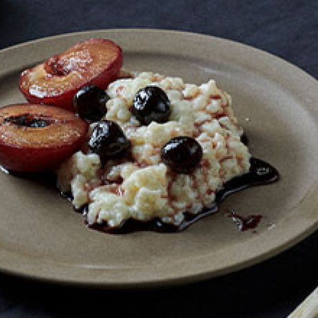 Danish rice pudding with oven baked plums and cherries