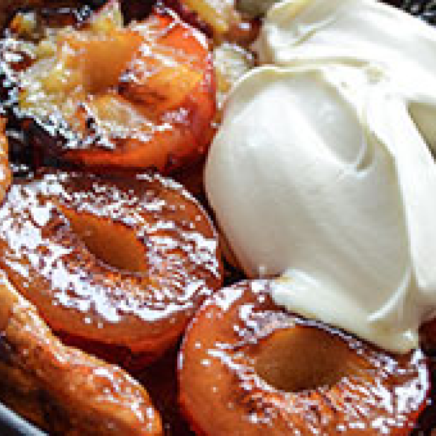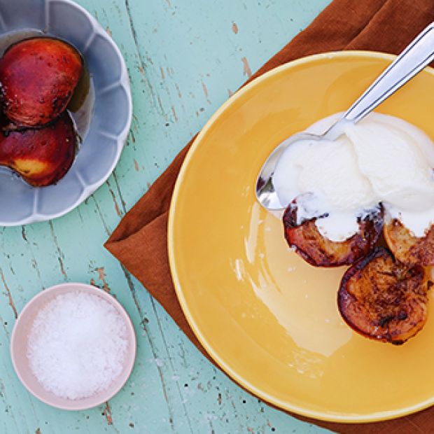 Campfire grilled spiced peaches with ice cream