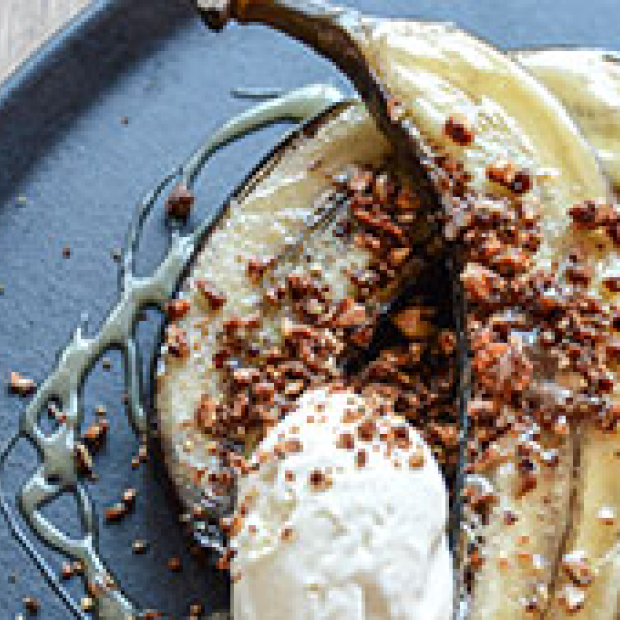 Grilled bananas, vanilla ice cream and salted caramel