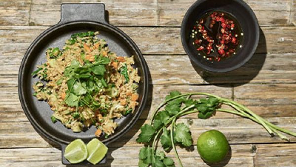Fry garlic in 5 tbsp oil at medium heat till golden. Turn the heat up to maximum before adding the rest of the vegetables. Fry for a few minutes at maximum heat. Then add rice and meat. Fry everything well for about 2-3 minutes. Add the egg, mix well with the hot vegetables and the rice. Fry well at medium heat till the egg has been cooked. When the sauce (about 1-2 dl) is added, turn up to maximum heat. Toss well and then turn off the heat. Serve with chilli, lime, chopped coriander and a little fish sauce on the side.
