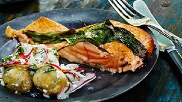 Blend salt, sugar, freshly milled pepper and chopped wild garlic (ramsons) together and rub into the fleshy side of the salmon.