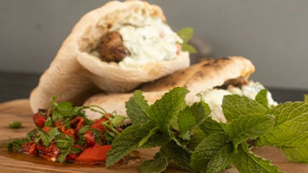 Serve the meat in the freshly baked pita bread together with grilled pepper and tzatziki