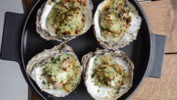 Mix crème fraîche with finely chopped garlic, parsley, salt and pepper. Open oysters, dispose of the surplus liquid and remove the oyster from the shell with an oyster knife. Check for any shell fragments. Spread over the crème fraîche mixture and top with breadcrumbs and finely grated parmesan. Grill oysters until the topping starts to turn golden.