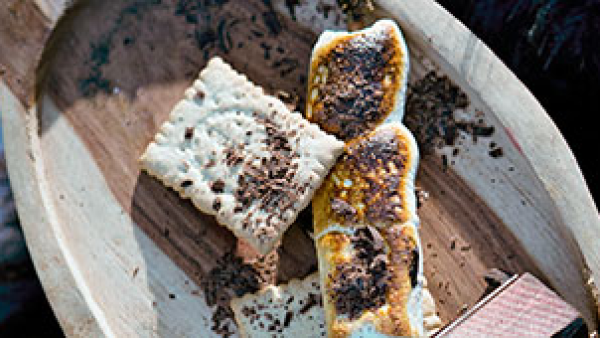 Put the marshmallows on sticks and grill them golden over the fire. Lay them on half of the biscuits, grate the chocolate over the hot marshmallows and top the "burgers" with the other biscuits.