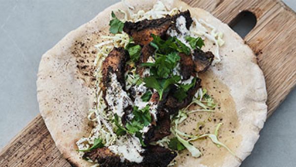 Take out one of the flatbreads. Place a handful of pointed cabbage salad on top. Cut the mushrooms into slices of 1 cm (0.4 inch) and place them on top of the salad. Pour 2 tbsp tahin dressing onto the mushrooms. Sprinkle a pinch of sumac and some mint on top to finish off the best shawarma in the world.