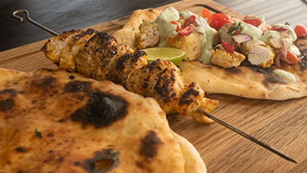 Serve the chicken skewers on naan bread together with coarsely chopped cherry tomatoes, finely chopped red onion and coriander yoghurt.