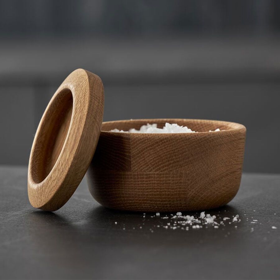 Salière décorative avec couvercle en chêne. Le chêne est un bois magnifique, chaud et résistant, qui peut durer de nombreuses années et devient plus beau avec le temps. Peut être utilisé à la fois dans la cuisine et sur la table à manger.