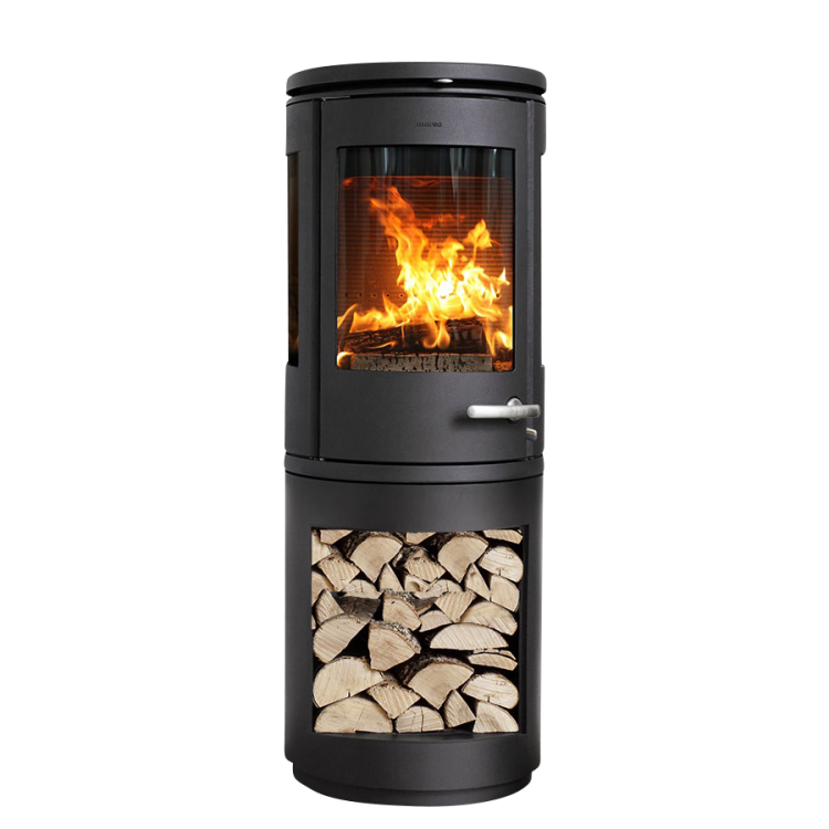 The spacious storage for firewood takes the wood stack right into the room, allowing the pale wood to stand out distinctly. At the same time, the firewood storage space fulfils the function of elevating the round burning chamber and its impressive glass section.