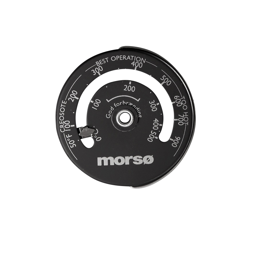 The Morsø flue gas thermometer is attached to the uninsulated flue pipe with a magnet and is used to measure the temperature of the smoke in the flue pipe right above the stove.