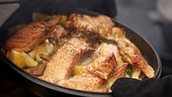 Melt the butter in a Morsø Frying Pan. Sauté the vegetables in the butter. Lay the salmon filets on top of the vegetables and place the frying pan in the Forno for 8-10 minutes.